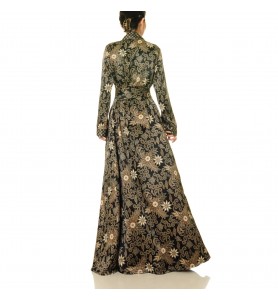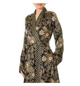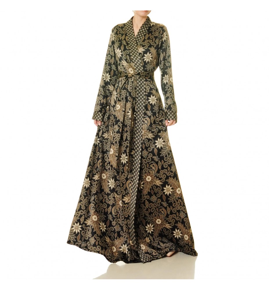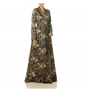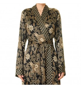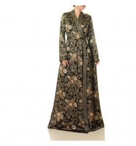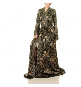 A black base, gold floral pattern, and contrasting geometric trim—this wrap robe perfectly frames the figure with drama and elegance. Tie a tie to define the waist, and the flowing skirt adds a touch of elegance.
