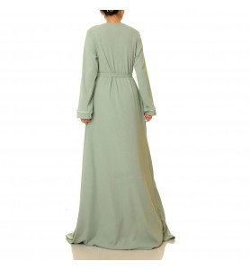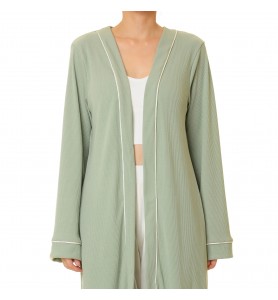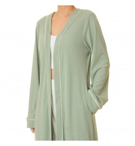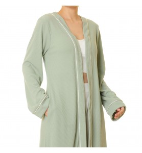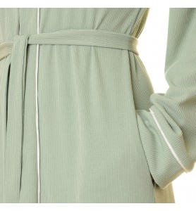 This soft sage wrap robe features clean white piping. Tie it once for a naturally fitted silhouette—long sleeves, a flowing hem, and pockets make it easy to go from home to the street.