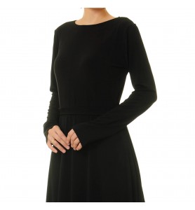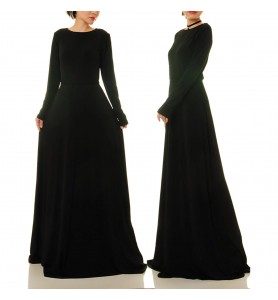 Minimalism meets fashion. This black maxi dress features a clean boat neckline and long sleeves. The fitted bodice and flowing hem create an effortless, graceful look that's effortless and effortless, perfect for both on the go and in front of the camera. Pair it with simple flats and a trench coat, or add heels, a clutch, and sparkling jewelry for a more elegant look.