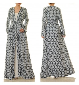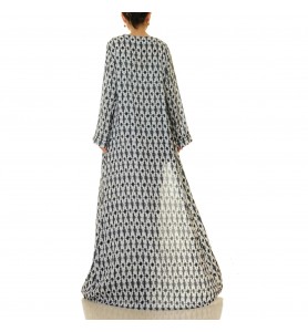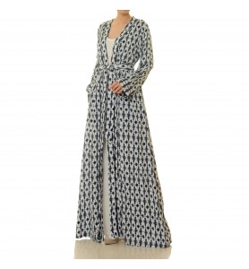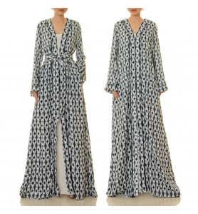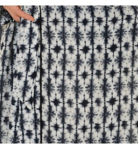 This robe features a minimalist front-opening design with a clean V-line. The dense black and white geometric print creates a sense of rationality and order. The waist tie with the same fabric allows for a custom fit, while the long sleeves and flowing hem create an elegant vertical line with every step. Side slit pockets combine practicality with style. Throw it casually for a relaxed look, or cinch it at the waist for a more streamlined look.
