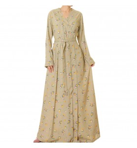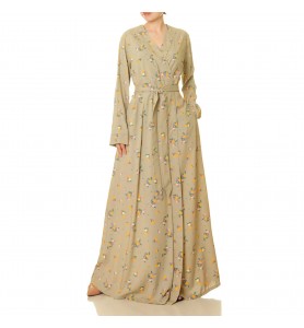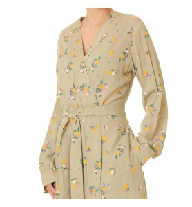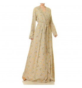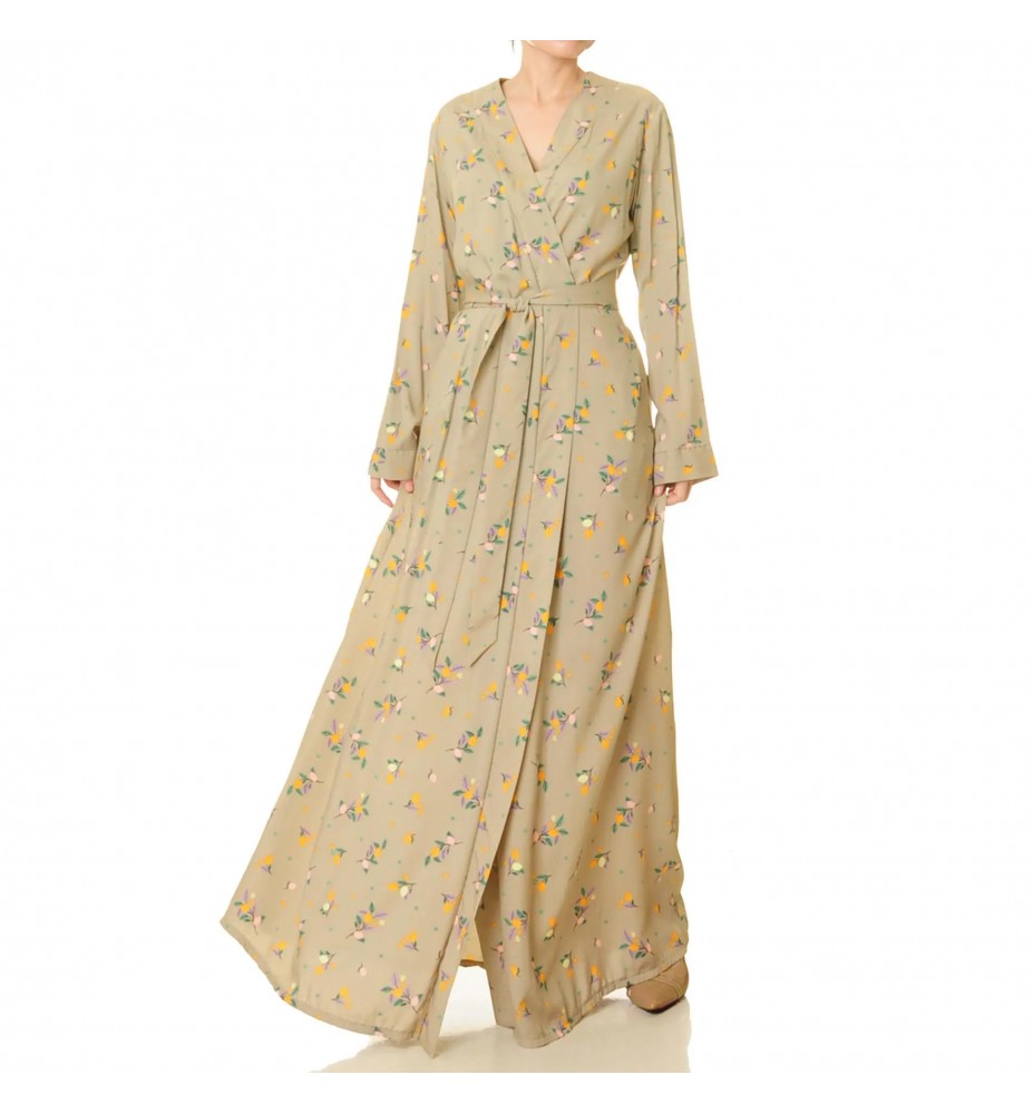 This style features a light apricot base, adorned with micro-floral detailing, creating a fresh and gentle visual effect. The wrap-around construction creates a slender V-line, and the built-in waistband allows for an adjustable fit. The long sleeves and flowing hem create an elegant vertical line, creating a relaxed look with every move. Whether layered for a sophisticated weekday or casually worn on a weekend getaway, it's sure to look stunning.