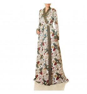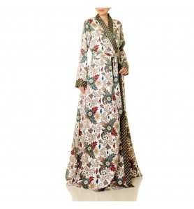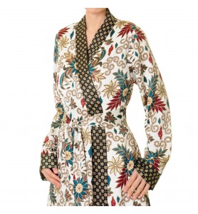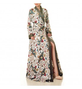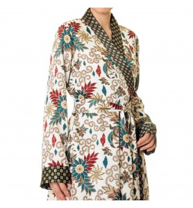 This robe features a minimalist wrap structure, embellished with a rich floral pattern. The geometric, color-block piping creates a clean, defined edge. The V-neckline flatters the neckline, and the built-in waistband allows for an adjustable fit. The long sleeves and flowing hem create an elegant vertical line for movement, while the center front slit enhances mobility and a sense of lightness. Whether draped casually or tied at the waist, it creates a relaxed yet stylish look.