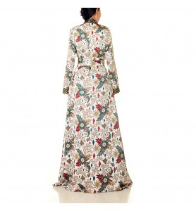 Long sleeves and a flowing hem: The floor-length silhouette elongates proportions, while a center front slit allows for easy walking and a graceful gait.