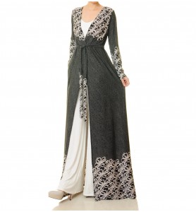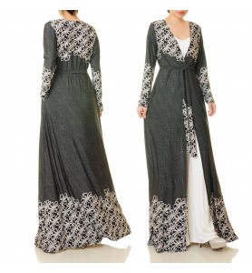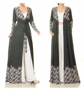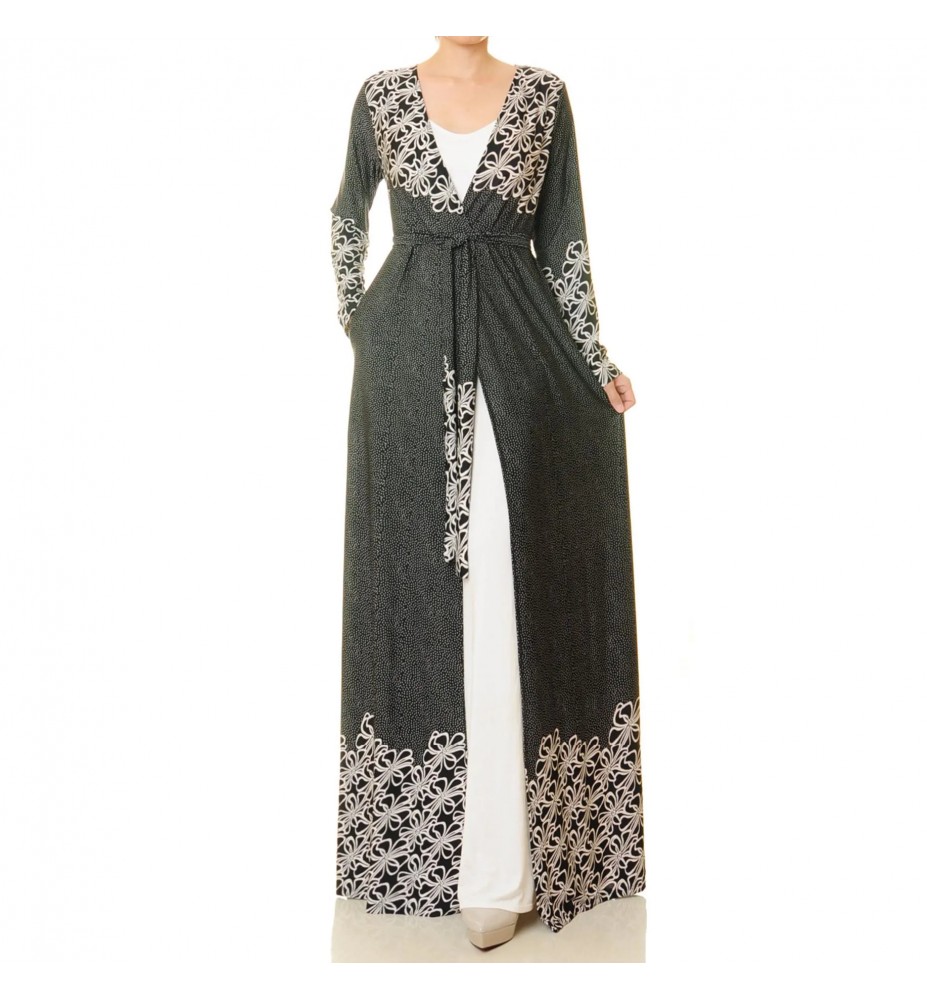 This robe features a minimalist, double-breasted design, creating a clean V-line. The waist tie in the same fabric allows for an adjustable fit. A dark base fabric accented with ivory floral borders at the cuffs and hem creates a clean focal point. The flowing long skirt and center front slit create a flowing curve with every step, adding both elegance and mobility. Throw it casually for a relaxed vibe, and cinch it at the waist for a refined look, perfect for daytime outings or evening getaways.