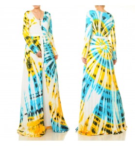 This maxi skirt combines a minimalist wrap silhouette with a vibrant tie-dye design: Radiating ocean blue and sunshine yellow scatter across a white background, the color blocks flowing with each step, creating a photogenic look. The V-neckline flatters the neckline, and the built-in belt allows for a customizable fit. The long A-line hem creates a slender, vertical line, adding both style and comfort. Whether you're in the city or on a beach vacation, simply tie it to complete the look.