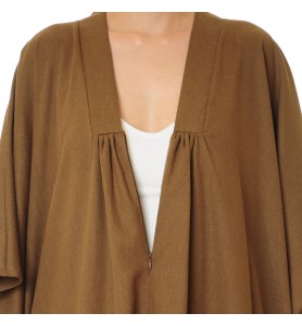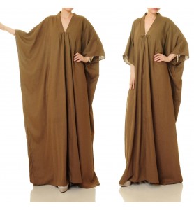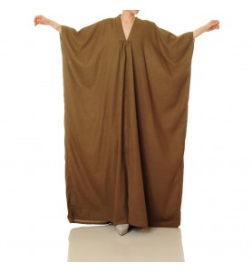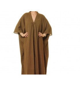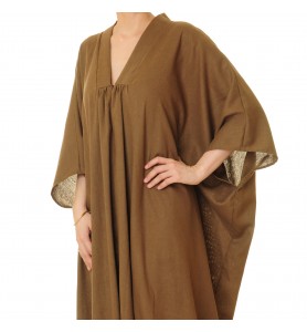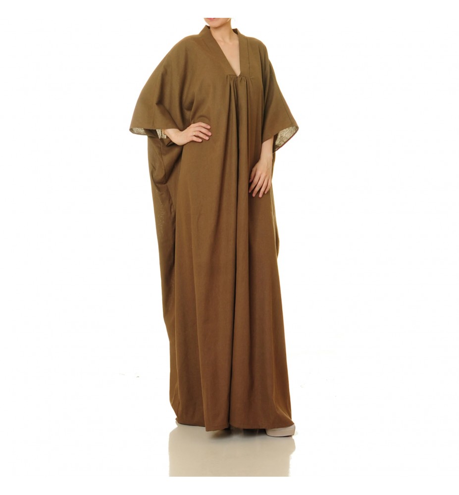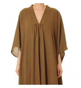This caramel brown robe features a one-piece kaftan silhouette with wide sleeves and dropped shoulders for maximum comfort and inclusion. The V-neckline is crisp and clean, while fine pleats at the bust add a rhythmic touch to the generous fabric. The sweeping hem creates an elegant flow with every step, creating a relaxed vibe when draped casually. Add a belt to create a 3D X-shaped silhouette, perfect for any occasion.