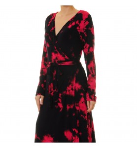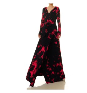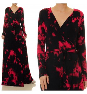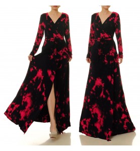 This maxi dress features a minimalist V-neck wrap structure, creating a slender silhouette, and a built-in waistband for custom fit. The interplay of red and black cloud dyes across the fabric creates a dialogue between night and flame. A center front slit enhances mobility and a sense of lightness, while the long A-line hem creates a flowing curve with every step. Simply tie it on for a stylish look, effortlessly transitioning from day to night.
