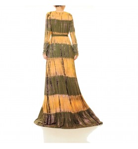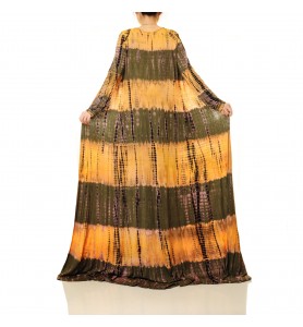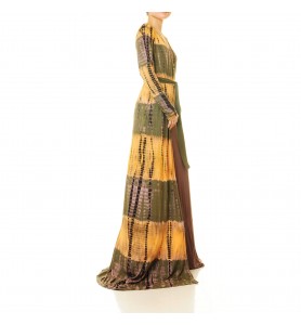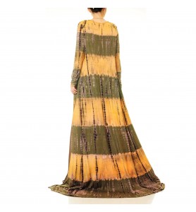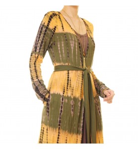 This robe features minimalist double-breasted lines, accented by a striking tie-dye color scheme: olive green and amber yellow, cascading across the woods, evoking a retro and atmospheric vibe. The V-neckline flatters the neckline; the matching fabric waistband allows for an adjustable fit. The long sleeves and floor-length hem enhance the figure, while the center front slit allows for increased mobility and a sense of flow. Side slit pockets enhance practicality and a relaxed fit.